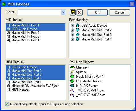 3. Run MIDI-OX. Go to Options->MIDI Devices... and select MIDI In/Out ports as shown below: